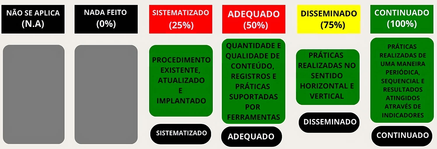 O método de avalição do processo de cada área de manutenção é amostral, com base em evidências solicitadas pelo avaliador. Faz parte do processo de avaliação o alinhamento das equipes, avaliadora e avaliada, após a visita às áreas e verificação das evidências fornecidas. Algumas perguntas têm como critério de validação a verificação de itens em campo, através de observação e/ou entrevistas aleatórias com os profissionais de nossos clientes.